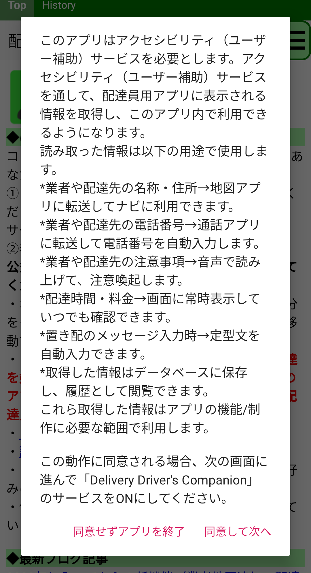 ユーザー補助サービスの使用に同意される場合は、「同意して次へ」をタップし、「Delivery Driver's Companion」のユーザー補助の使用をオンにしてください。