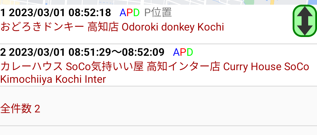 各リストの項目には、配達日時、A・P・Dの情報の存在、業者名等を表示しています。タップすると該当の配達が地図上でアクティブ表示になります。
