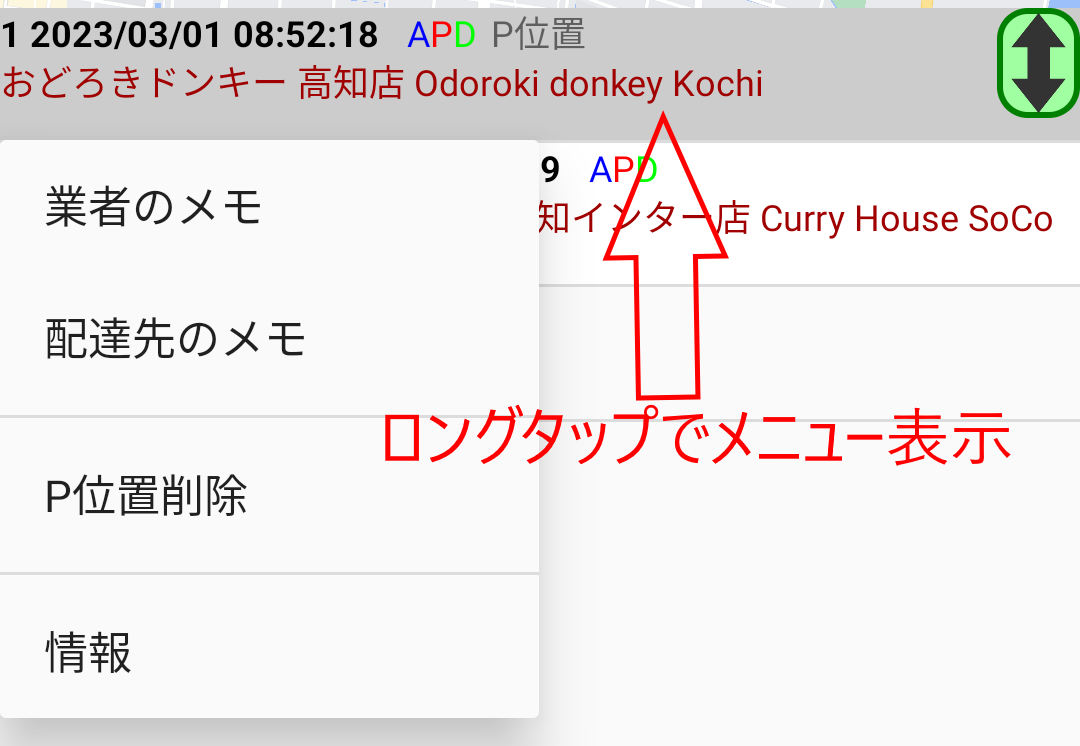 各行をロングタップするとメニューが表示され、業者と配達先のメモ入力と、登録されているP位置の削除、および情報を表示できます。