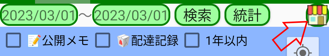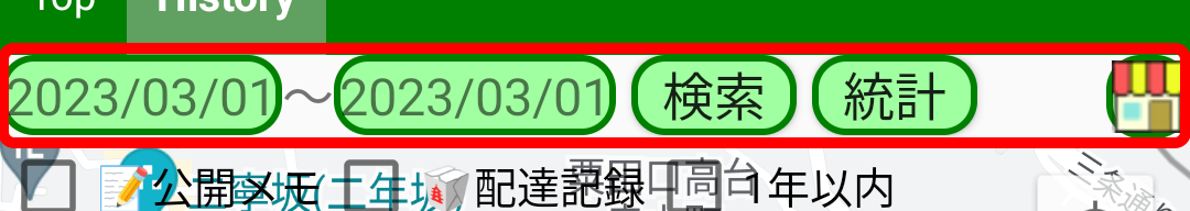 左端の日付の範囲は、タップして表示されるカレンダーから変更できます。スワイプアウトすることで特定の日付を素早く入力することもできます。この日付は「検索」ボタンと「統計」ボタンに使います。右端の店舗のアイコンは業者地図を表示します。業者地図には日付の範囲は関係しません。