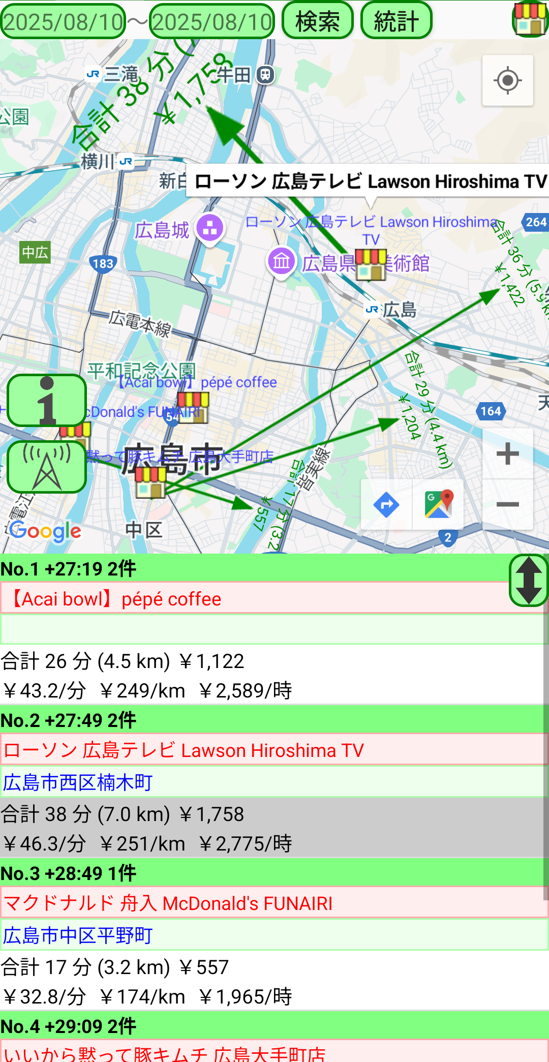 「検索」をタップすると、地図とリストの形式で、ご自身の配達の記録を表示します。