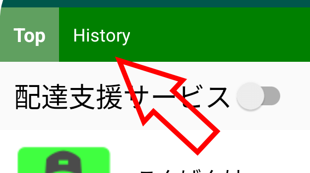 上部の「Top」「History」と書かれた緑色の部分をタップして表示ページを切り替えます。