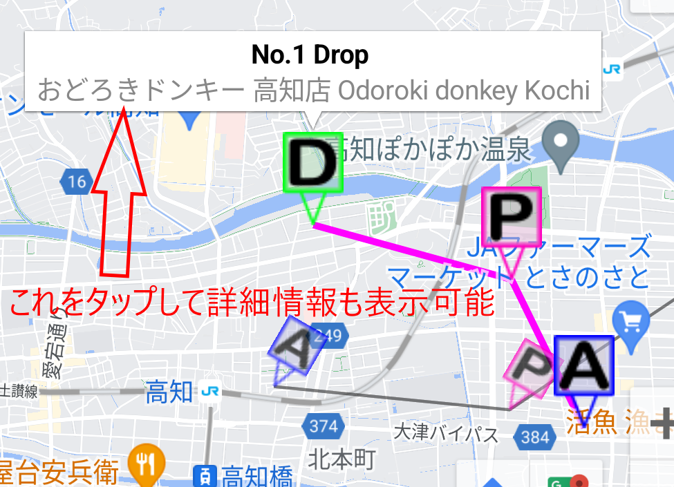マーカーをタップすると、情報ウィンドウに番号や業者名等の情報を表示し、関連する他のマーカーもアクティブになります。また、対応するリストの項目も選択状態になります。その情報ウィンドウをタップすると、配達に関する詳細な記録を表示できます。