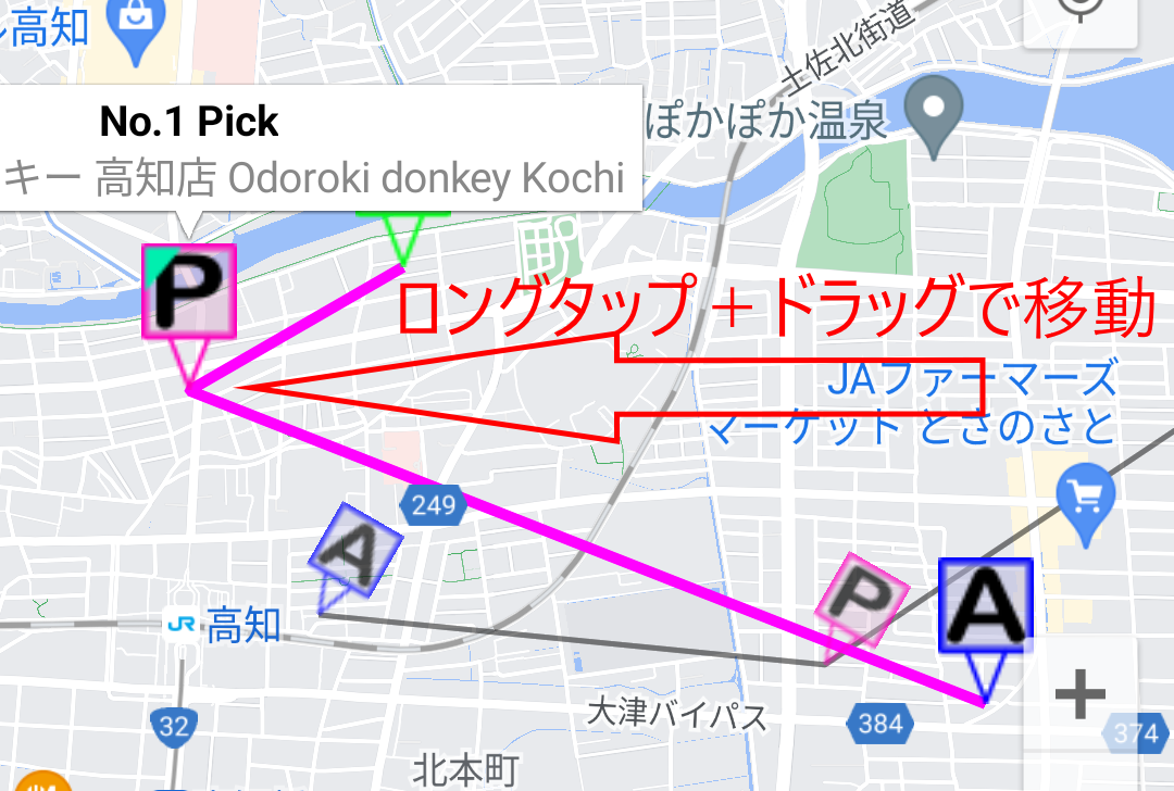 アクティブになったPのマーカーはロングタップすることで、ドラッグして移動できます。