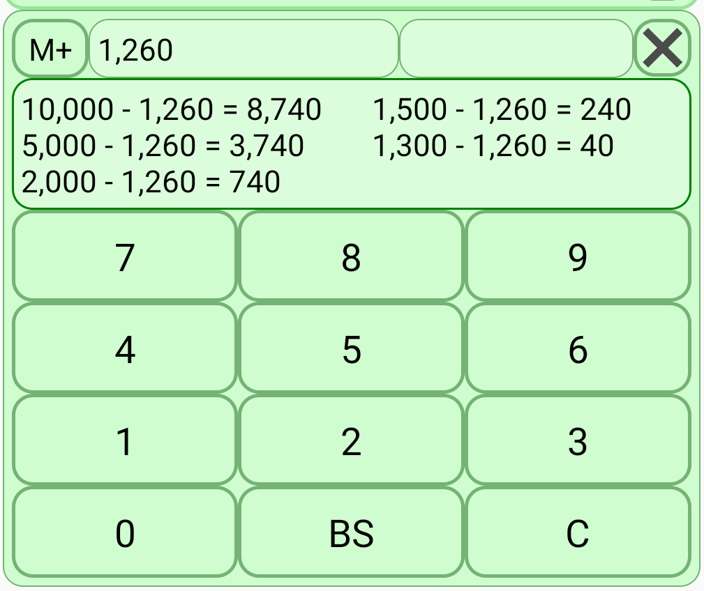 一件目の金額を表示している時に、「M+」ボタンをタップすると、その金額を加算するためのボタンが現れます。