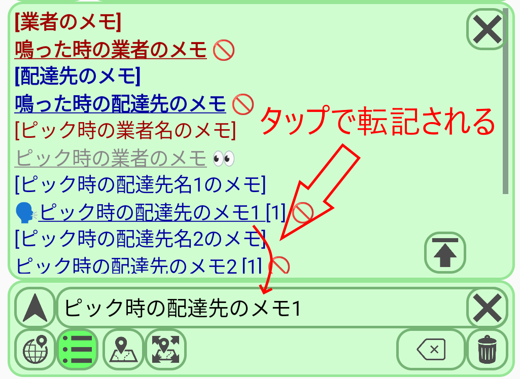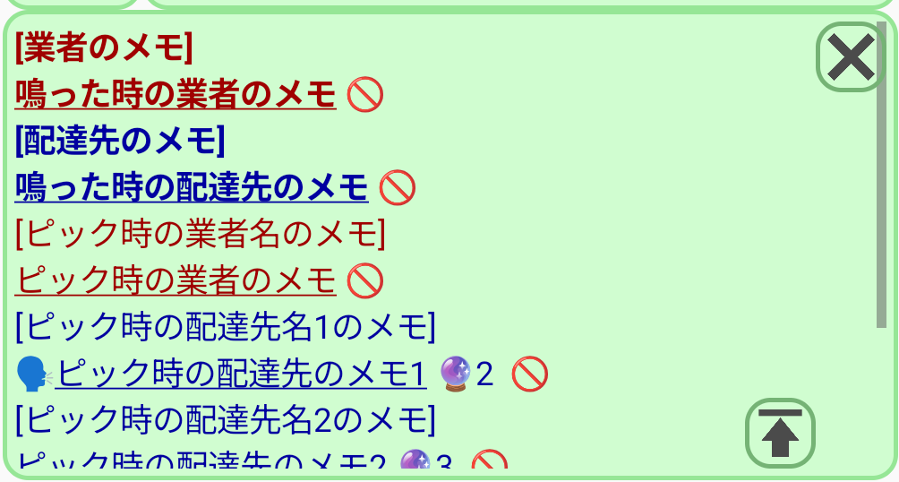赤字は業者のメモ、青字は配達先のメモです。太字は、呼び出し中に表示されるメモです。