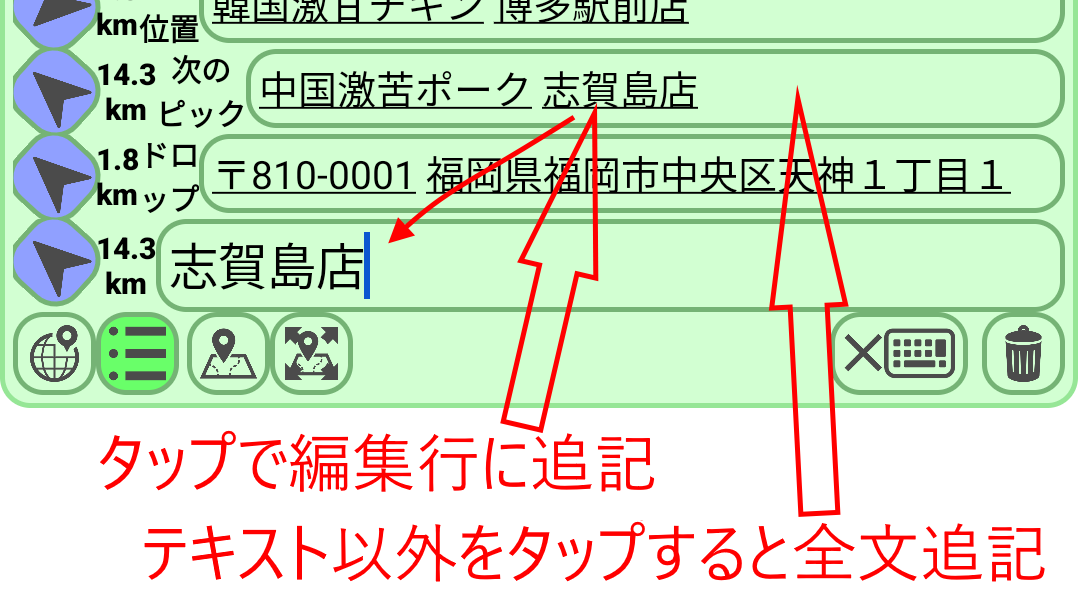 リストのそれぞれの住所行のテキストをタップすると、編集行の入力欄に(入力されているテキストの後ろに)追記されます。住所テキストは半角スペースで区切られた単位にタップ可能です。住所行の枠の中のテキスト以外の空白部分をタップすると、その行の全テキストを編集行の入力欄に追記します。