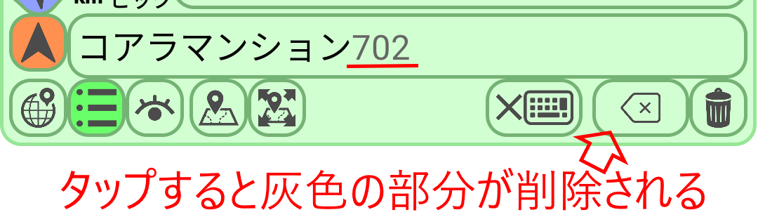 編集行のテキストの後方からワンタップで部分削除する機能があります。これはマンション等の部屋番号または、文字種類の異なる位置を区切りとしたテキストが対象となります。対象部分テキストは灰色で表示します。
