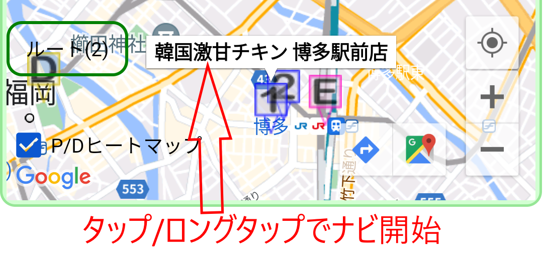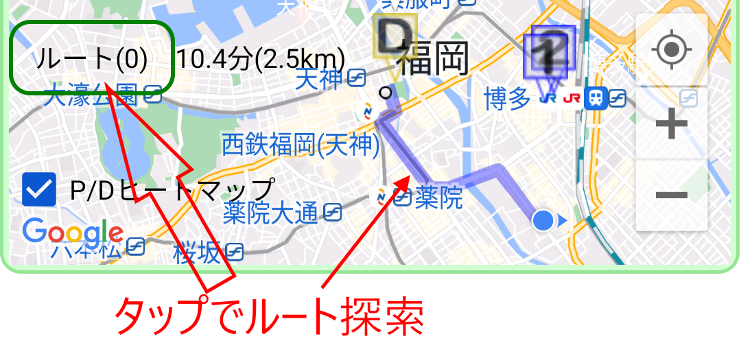 マーカーが選択状態の時、地図の左に「ルート」ボタンが表示されます。タップすると現在地から選択されているマーカーまでのルートを表示します。