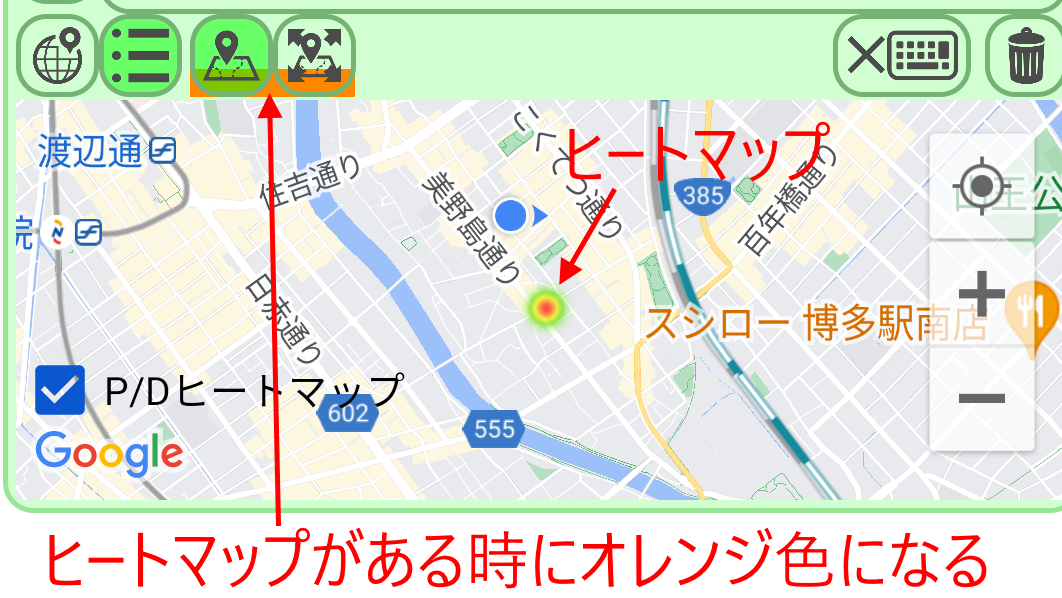 ピックやドロップ中に、地図上にヒートマップが表示されることがあります。コンパニオンユーザー全体の配達記録をもとに表示しており、ピック位置やドロップ位置を特定するためのヒントとして参照できる可能性があります。同一地域にコンパニオンユーザーが多いほど情報が充実していくため、ぜひ他の配達員にもコンパニオンの使用をおすすめしてください。